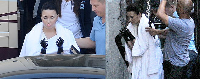 A cantora foi fotografada saindo de seu trailer e indo para o local da gravação – aparentemente destruído – com as mãos pintadas de preto, um vestido branco e botas. Clique nas miniaturas para conferir as imagens em tamanho maior.